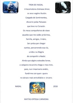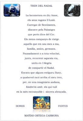Poema de Navidad 2018, versionado (con alguna licencia en la traducción) en las lenguas Castellana, Catalana y Gallega, propias de los entornos en los que pasa sus días y de los paisajes por los que discurre su vida, en ellos no existen las fronteras porque todo está unido su mi corazón.
