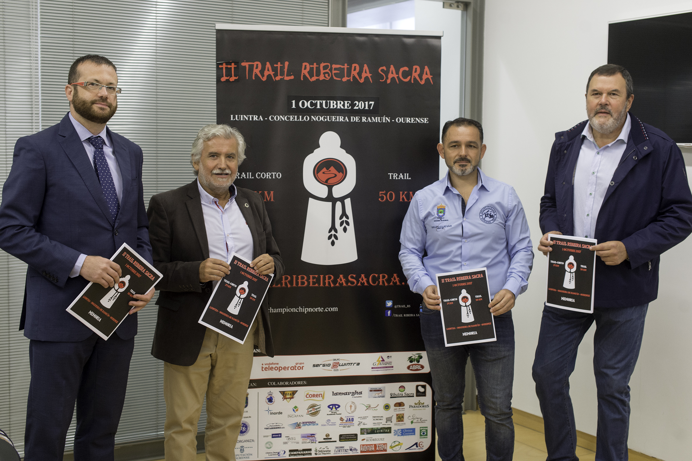 Los aficionados al deporte y la montaña tienen una cita ineludible el día 1 de octubre en la segunda edición del “Trail Ribeira Sacra”, un evento deportivo que ofrece a los participantes dos posibles trayectos: un mini-trail de 24 kilómetros y un trail con un recorrido de 50 kilómetros. La presentación de esta prueba deportiva tuvo lugar en el Centro Cultural Marcos Valcárcel de Ourense, acto en el que participó el vicepresidente de la Diputación, Rosendo Fernández; el alcalde de Nogueira de Ramuín, César Parente; el presidente del Club Grupo Cuevas, Diego Novelle; y el director general del Grupo Cuevas, Artur Yuste.