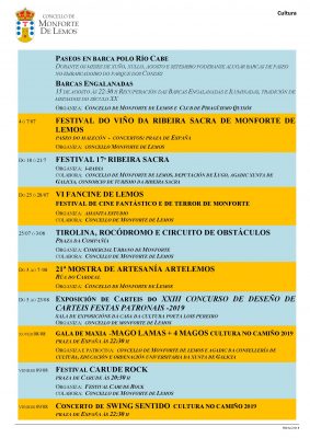 Entre las actividades programadas destacar las del ciclo “Cultura no Camiño 2019”: la Gala de Magia del Mago Lamas y 4 magos más, de 8 de agosto , y el concierto Swing Sentido del viernes 9 de agosto. Y también aquellas en las que colabora la Diputación de Lugo: los conciertos de Doc Magoos (10 de agosto), Garufa Blue Devils Big Band+Sito Sedes (11 de agosto), Os Parentes (12 de agosto) y los conciertos de David Prado y Sr. Jingles (24 de agosto).