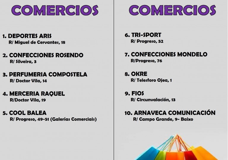 En esta ocasión, los establecimientos que participarán son Deportes Aris, Confecciones Rosendo, Perfumería Compostela, Mercería Raquel, Cool Balea, Tri-Sport, Confecciones Mondelo, Okre, Fíos y Arnaveca Comunicación.