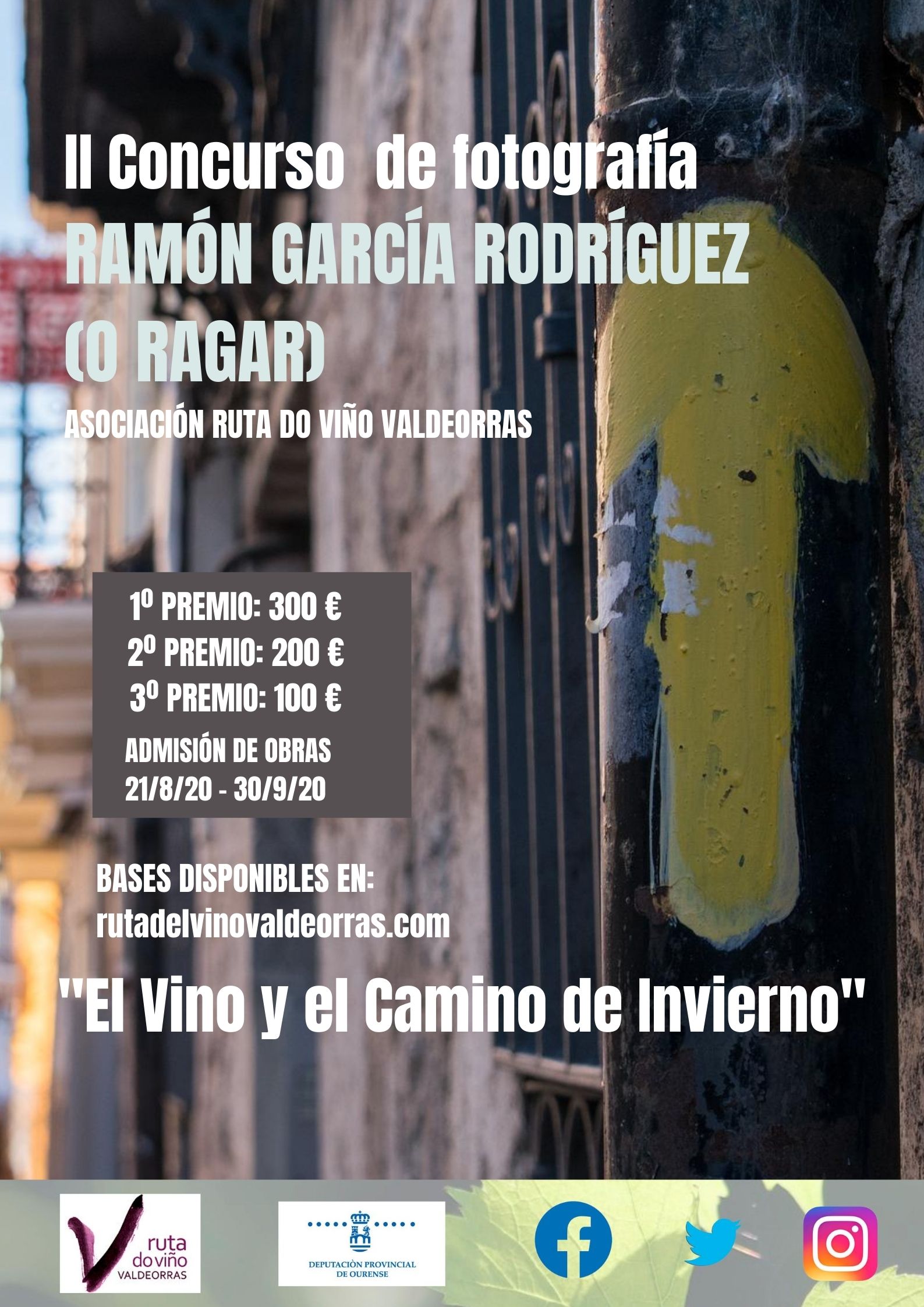 La Ruta del Vino de Valdeorras, convoca, con el patrocinio de la Diputación de Ourense, el II Concurso de Fotografía de la Asociación Ruta do Viño de Valdeorras Ramón García Rodríguez más conocido como “O RAGAR”. Es alguién que forma parte de la historia de este lugar y muy vinculado al mundo de la fotografía. La primera cámara que conoce es la de su padre. A los 18 años cuando va a la mili en el cuerpo de paracaidistas aprovecha para hacer un curso de fotografía. Tenemos ante nosotros un autodidacta que sabe sacar a luz lo mejor de cada oficio que realizó a lo largo de su vida, gran lector, amante de la buena música y de una conversación siempre cargada de sabiduría. Tuvo la fortuna de convivir con su abuelo de Petín y con un maestro que le dio clases nocturnas. Después Valdeorras tuvo el placer de de que o RAGAR se entregará a la labor de recuperar o Camiño de Inverno siendo el fundador de la Asociación de Amigos do Camiño de Santiago por Valdeorras.