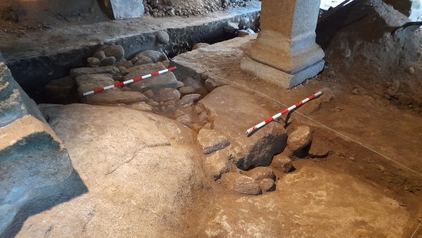 Los trabajos que están actualmente en marcha permiten ampliar los datos obtenidos en los sondeos valorativas que se llevaron a cabo en el espacio interior bajo la actual sacristía de la iglesia hace unos meses. En esta actuación, que se hizo en una superficie de unos 15 metros cuadrados, se definieron restos de muros anteriores a la actual sacristía, datada so siglo XVII a solo 10 centímetros de la superficie.