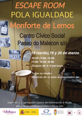 - O Escape Room pola Igualdade para todos os públicos terá lugar este venres 18 de marzo, en 3 sesións pola tarde, e o sábado 19 e domingo 20, con 3 sesións de mañá e 3 de tarde cada un deses días