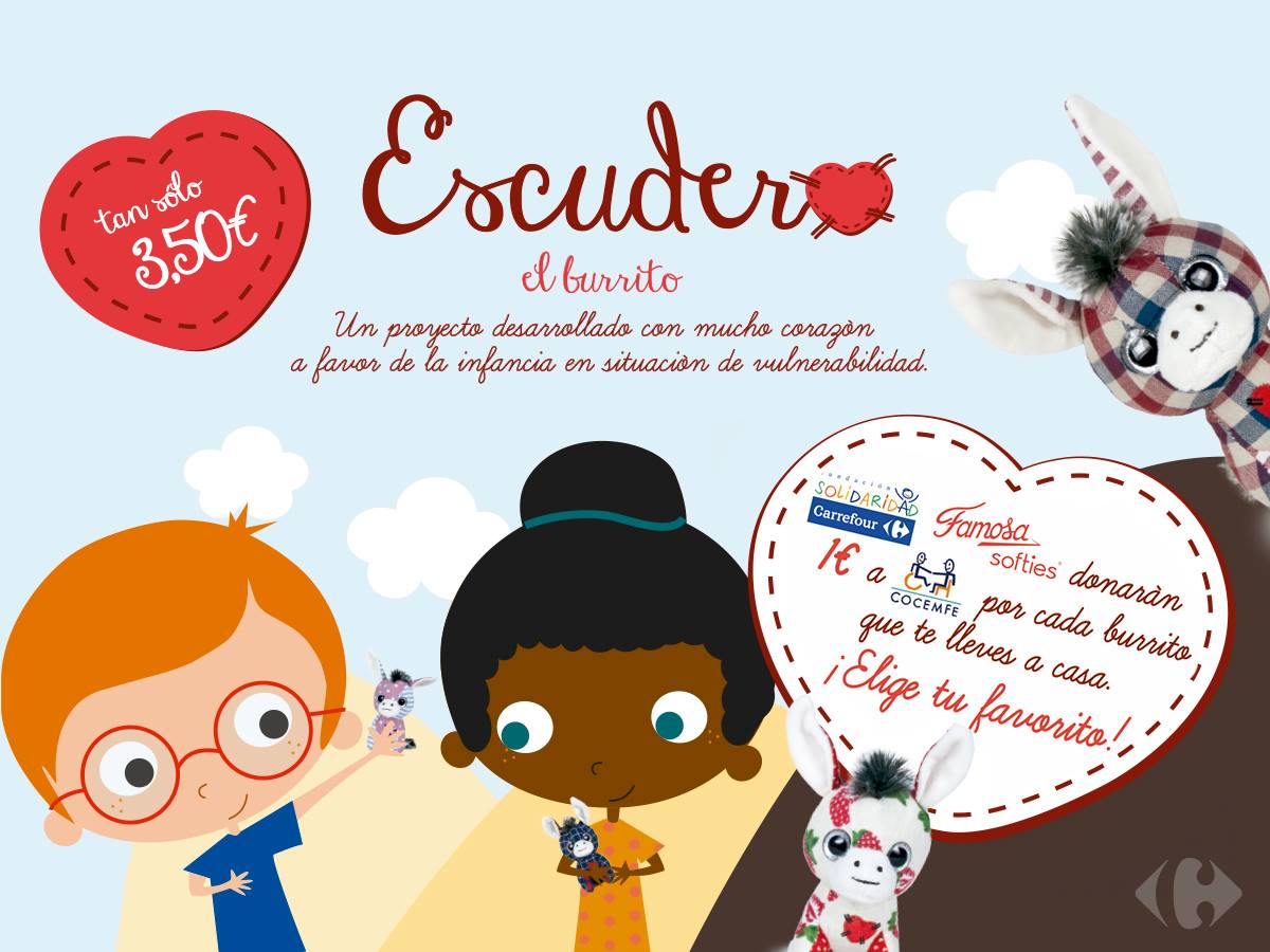 Escudero es un burrito solidario que puede adquirirse por 3,5 euros en los centros comerciales y supermercados Carrefour. De ese dinero 1 euro irá destinado a entidades de COCEMFE para que puedan desarrollar aquellos proyectos dirigidos a la infancia con discapacidad que requieren de un medio de transporte adaptado.