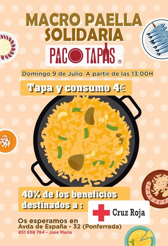 Paco Tapas realizará un macro paella solidaria este domingo día 9 de julio a partir de las 13:00 horas. Por sólo cuatro euros se tendrá consumición y tapa de paella cuyos beneficios, irán en parte para Cruz Roja.