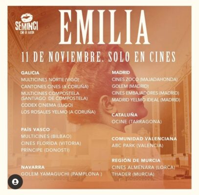 La cinta “Emilia”, además de la parte de ficción, se rodó en localizaciones que nos recuerdan su vida, material de archivo y entrevistas con diferentes personalidades de la talla de Inés Fernández Ordóñez, Eva Acosta, Marta Sanz, Xulia Santiso, Amalia Gallego, Marilar Ailexandre, la cocinera Estrella Michelín María Gómez, Nerea Aresti, el presidente del Ateneo y la directora del Museo Salzillo. El filme se estrenará en salas el último trimestre del 2022 y cuenta por ahora con las ayudas del Ayuntamiento de Madrid, TeleMadrid y la Región de Murcia