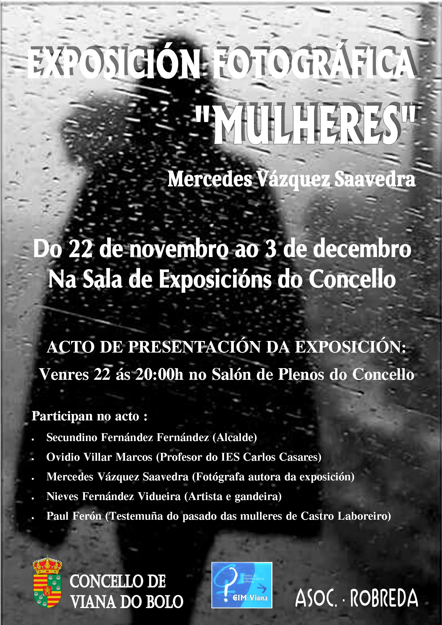Mañana viernes 22 de noviembre tendrá lugar, en el Salón de Plenos de Viana do Bolo, el acto de presentación de la Exposición Fotográfica “Mulheres” de Mercedes Vázquez Saavedra, escritora y fotógrafa, nacida en Sarria (Lugo)