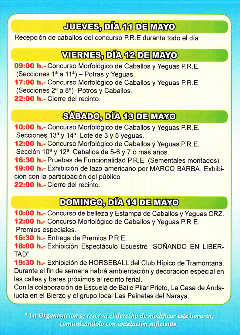 El último día, el domingo 14 de mayo, será el Concurso de belleza de Caballos y yeguas, así como la entrega de premios, a partir de las 16,30 horas. A las 18.00 horas tendrá lugar el espectáculo ecuestre “Soñando en Libertad” y después una exhibición de Horseball del Club Hípico Tramontana.