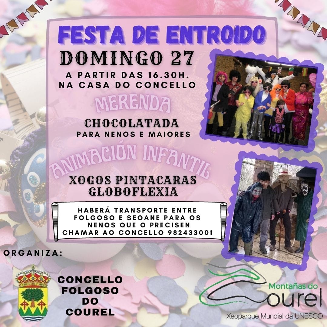 O Concello de Folgoso do Courel celebrará unha Festa de Entroido o vindeiro domingo día 27 de febreiro a partir das 16:30 horas na Casa do Concello.