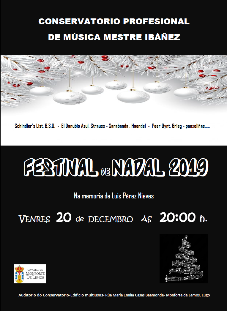 A las 20:00 horas, se celebrará en el Auditorio del Edificio Multiusos de Monforte el tradicional Festival de Navidad del Conservatorio Municipal. El recital está dirigido a todo el público en general y la entrada es gratuita.