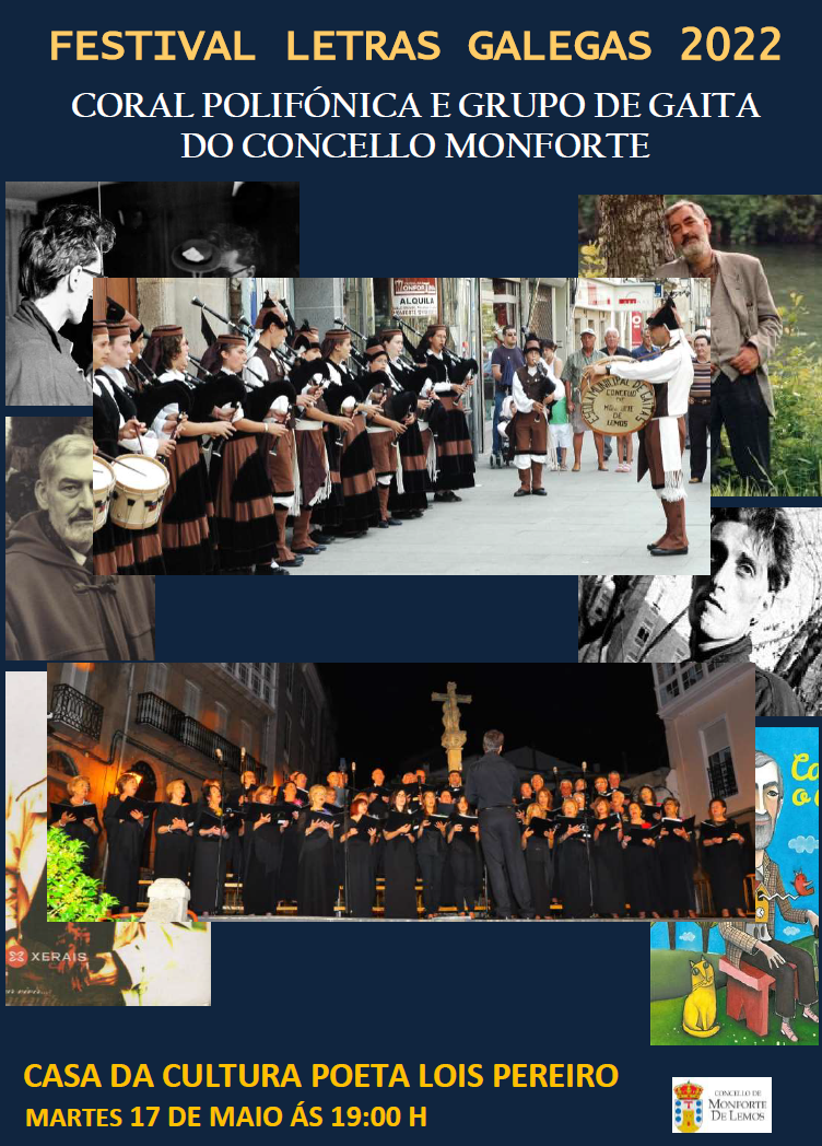 Deste xeito, tras dous anos de ausencia por mor da pandemia da Covid-19 o Concello recupera o Festival Letras Galegas 2022, que terá lugar hoxe martes 17 de maio, na Casa da Cultura Poeta Lois Pereiro a partires das 19:00 h.