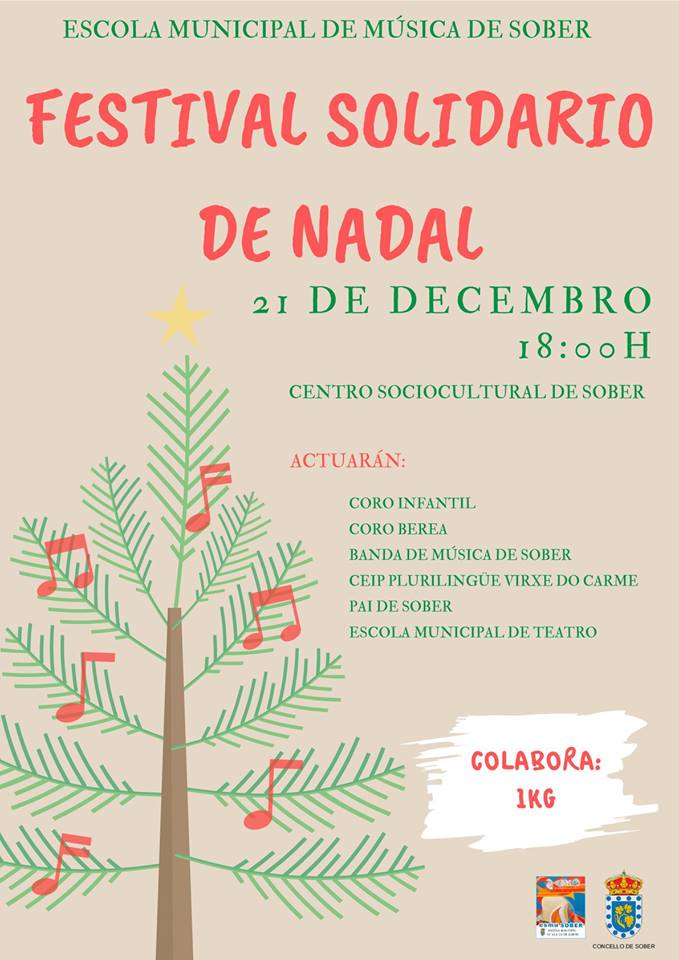 La Escuela Municipal de Música de Sober ha programado para este viernes día 21 de diciembre un Festival Solidario de Navidad en el que está previsto que participen la Banda de Música de Sober, el alumnado del CEIP Plurilingüe Virxe do Carme el PAI de Sober, la Escuela Municipal de Teatro, así como el Coro Infantil y el Coro Berea.