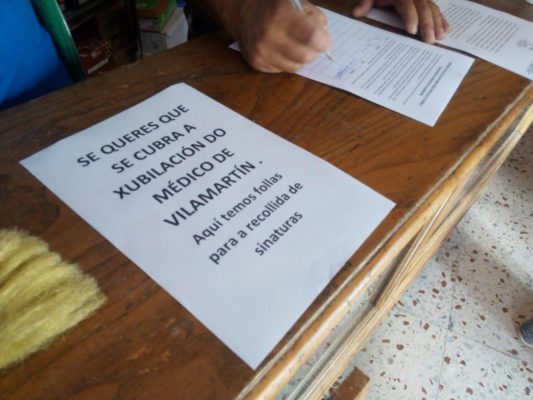 Somos conscientes de la necesidad de tener dos médicos en Vilamartín, sobre todo habida cuenta la dispersión y el envejecimiento de este ayuntamiento, por lo que no pretendemos quedar en la simple recogida de firmas y en caso de que la mediados de mes no tengamos una respuesta positiva, procederemos a planear las movilizaciones que sean precisas para recuperar los servicios públicos que precisamos.