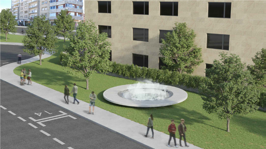 - La fuente evoca las aguas termales y As Burgas y se compondrá de anillos por los que discurrirá el agua, disponiendo de iluminación para realzar su estructura y visualizar el efecto “nube” en el agua