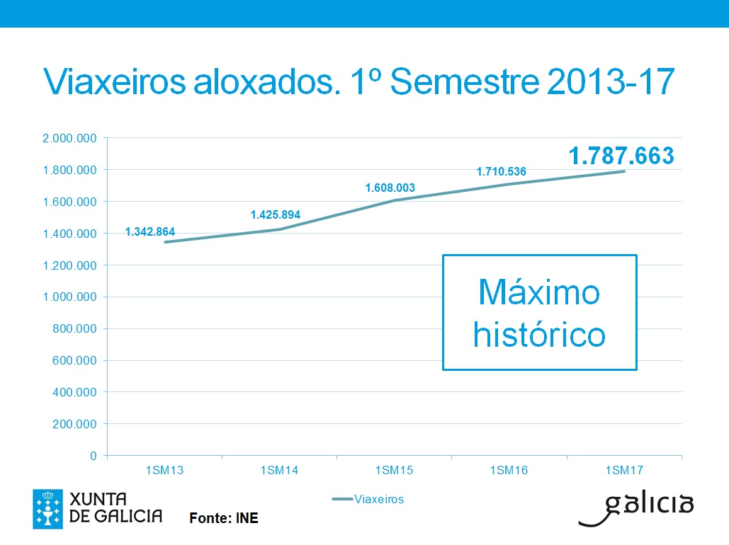 El primer semestre del año finalizó en Galicia con la mayor cifra de turistas de su historia. Hasta el mes de junio, cerca de 1,8 millones de viajeros se alojaron en los hoteles de la Comunidad gallega, según los datos publicados hoy por el Instituto Nacional de Estadística (INE). Estas cifras ratifican la tendencia positiva del sector turístico en los últimos años, lo que hace que este espere una buena temporada estival.
