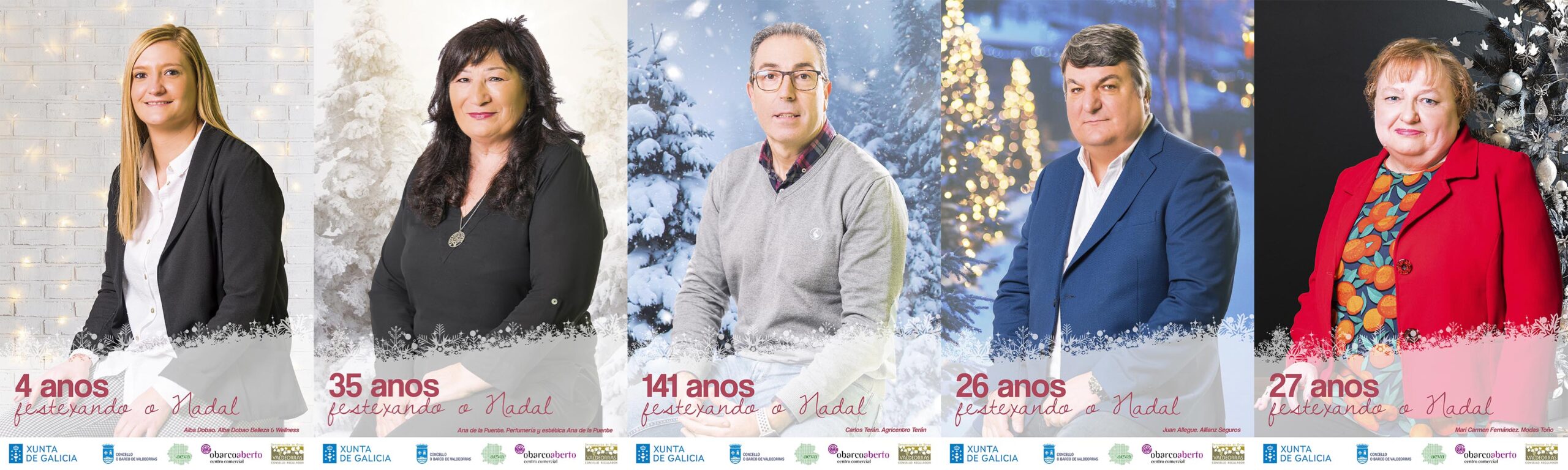 Paralelamente, ambas asociaciones han querido homenajear a los empresarios asociados que son los protagonistas de la cartelería de Navidad este 2022. De forma voluntaria y atendiendo a un llamamiento de AEVA y CCA O Barco, cinco empresarios de O Barco accedieron a prestar su imagen para la cartelería de Navidad que se distribuirá entre los establecimientos y se colocará en los mupis.