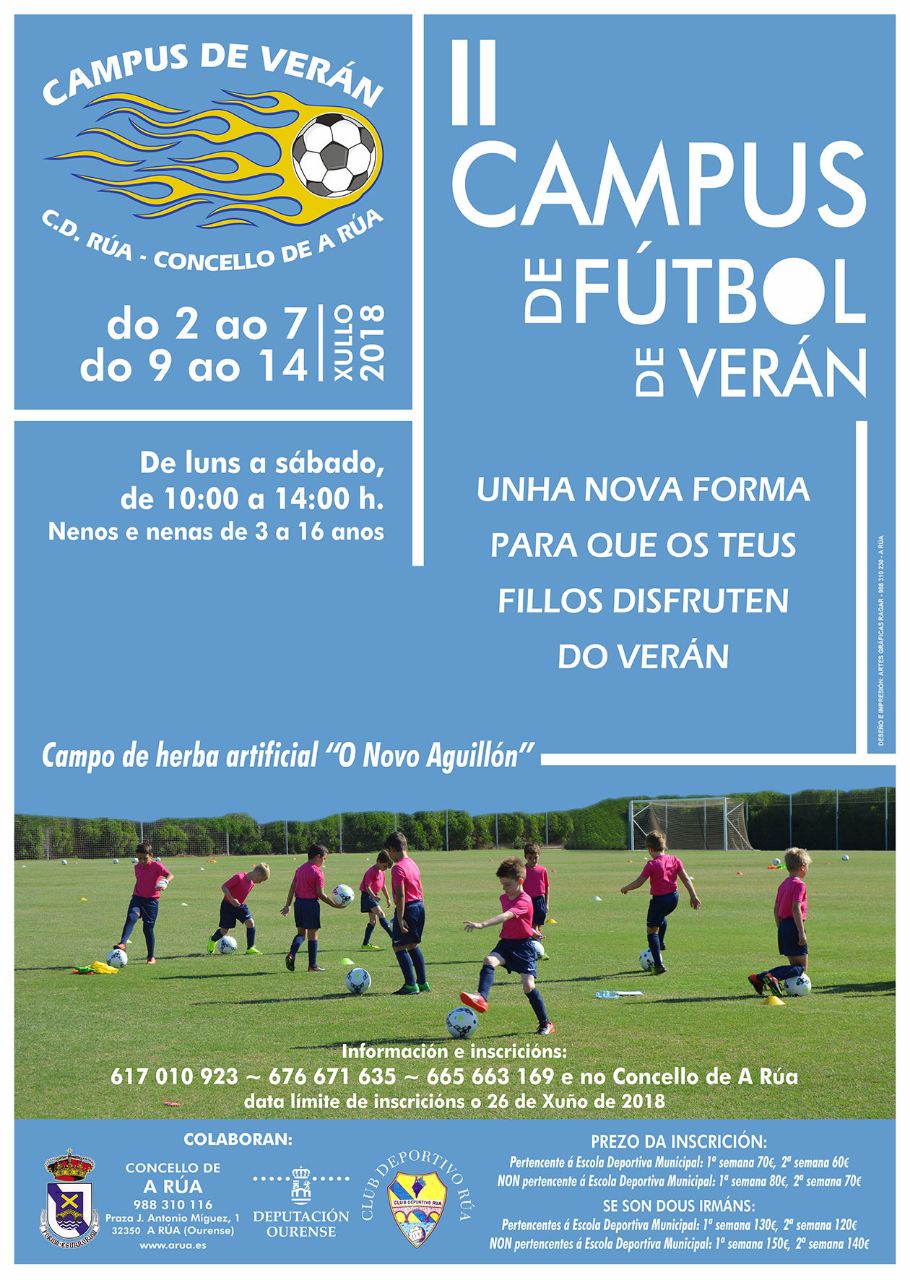 El Concello de A Rúa y el Club Deportivo Rúa organizan el II Campus de fútbol de verano. Este año, como novedad, se celebrarán durante las semana del 2 al 7 de julio y, posteriormente, del 9 al 14 de julio.
