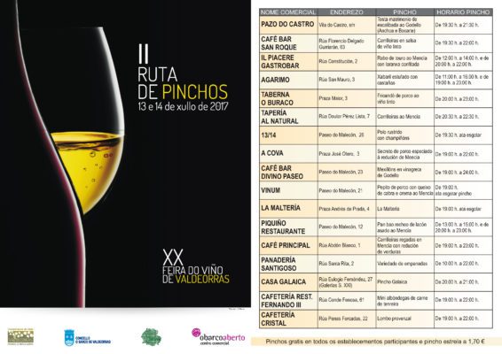 A partir de mañana, los días 13 y 14 de julio (jueves y viernes) se desarrollará en O Barco de Valdeorras la II Ruta de Pinchos con motivo de la celebración de la XX Feira do Viño de Valdeorras, fruto de la colaboración entre AEVA, Asociación Centro Comercial Aberto O Barco, Consello Regulador de la Denominación de Orixe y Concello de O Barco.