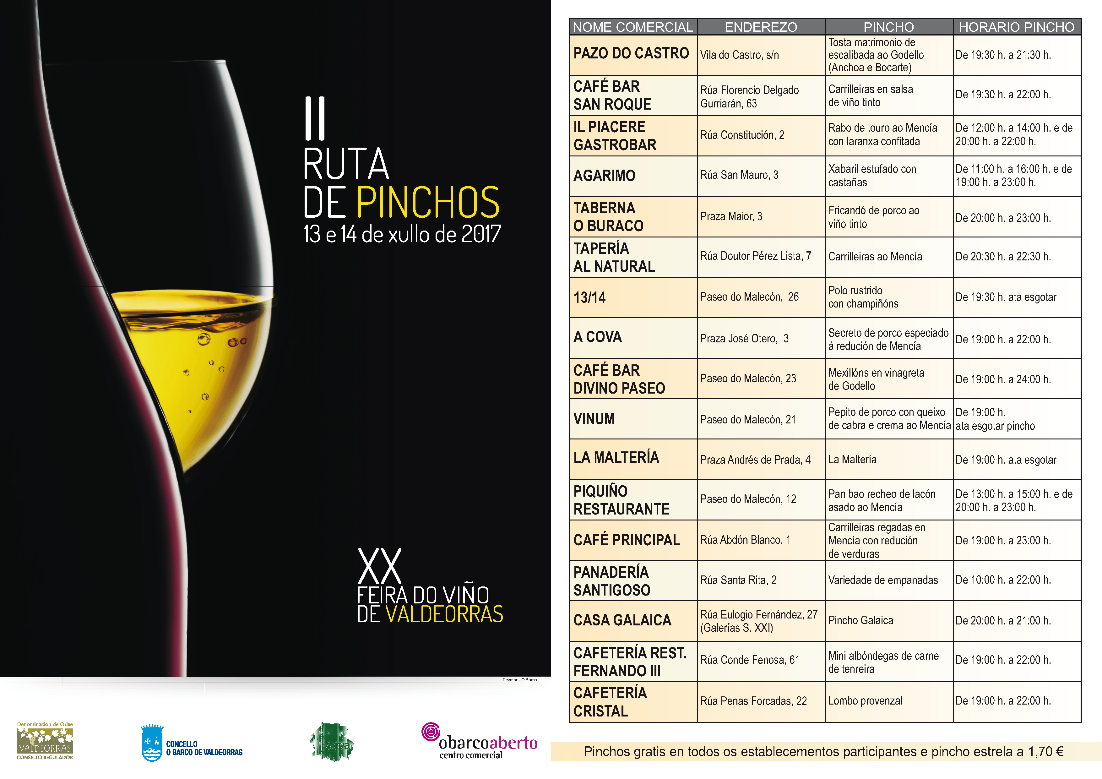En esta segunda edición de la ruta participan un total de 17 establecimientos hosteleros de O Barco. Para publicitar la ruta se elaboró una guía, en la que aparece el nombre del pincho y el horario en el que se sirve.