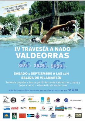El próximo sábado, 1 de septiembre, se desarrollará la “IV Travesía a nado Valdeorras”, de 350 metros, 2525 metros y 5050 metros. La salida será en Vilamartín, a partir de las 17,00 horas (frente a las piscinas municipales).