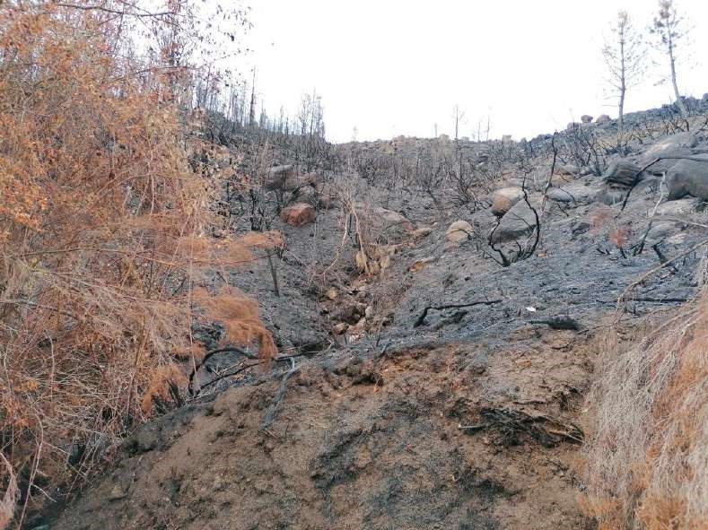 Se trata de una zona montañosa con fuertes pendientes donde, a causa del incendio, se ha reducido drásticamente la cubierta vegetal de la cuenca, por lo que se espera un gran efecto erosivo laminar y por regueros sobre los suelos de las laderas, generando a su vez un excedente extraordinario de flujos líquidos y sobre todo, sólidos, en los cauces, lo cual degradará los ecosistemas fluviales y al mismo tiempo podría generar problemas por arrastres y tapones en infraestructuras y poblaciones aguas abajo de la zona quemada.
