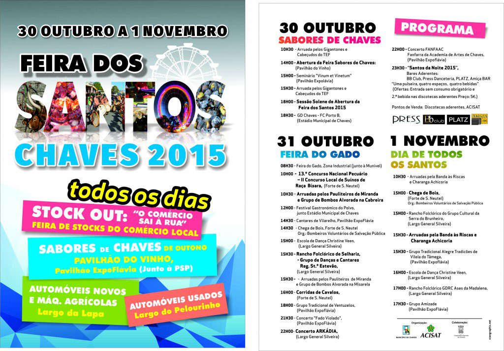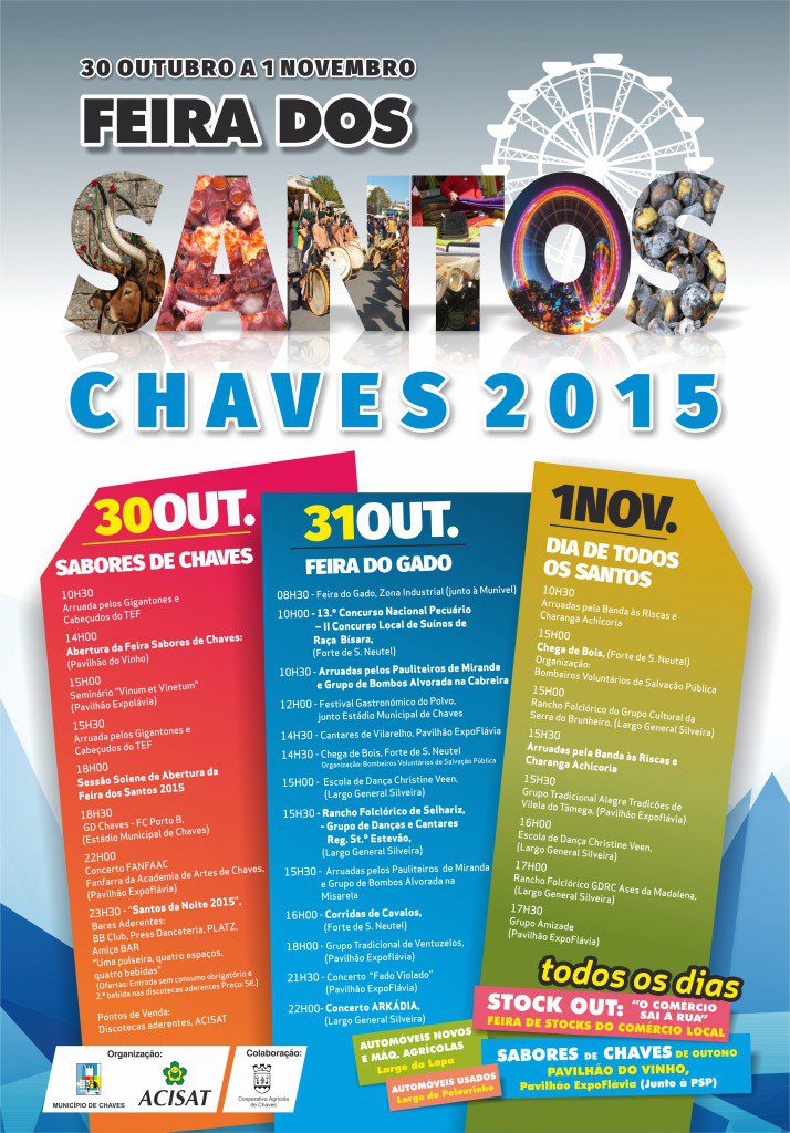 En O Barco, A Rúa, Viana y otras localidades de la comarca, hay vecinos que acuden a la ciudad portuguesa todos los años por Santos desde hace más de dos décadas. Y Chaves no es ajeno a a ello. De hecho, la Cámara municipal acaba de dar a conocer el programa de actividades previsto para la fecha. Así, el 30 de octubre se desarrollará la Feria Sabores de Chaves, este año dedicada al vino, a partir de las 14.00 horas, durante la que habrá un seminario sobre vino. Además, en esta jornada, que será amenizada por desfiles de gigantes y cabezudos, se procederá a la apertura oficial de la Feira dos Santos 2015, a partir de las seis de la tarde. Y a las 22 horas se desarrollará un concierto de Fanfarria da Academia de Artes de Chaves, en el Pabellón Expoflavia. A las 23,30 se celebrará Santos da Noite 2015, “Una pulsera, cuatro espacios, cuatro bebidas”, mediante el que se podrá degustar consumiciones en bares y lugares de ocio nocturnos.