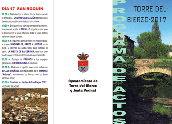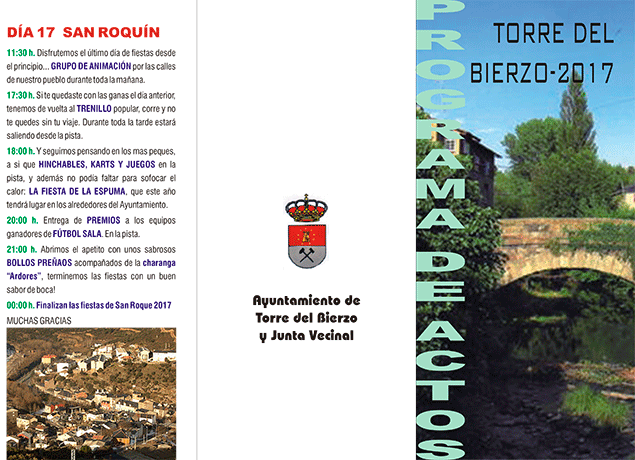 Torre del Bierzo celebra del 14 al 17 de agosto sus fiestas patronales en honor a San Roquín. La lectura del pregón correrá a cargo del atleta Miguel Martínez Basurco, el lunes 14, a las 20.30 horas, acompañado del alcalde, Gabriel Folgado.