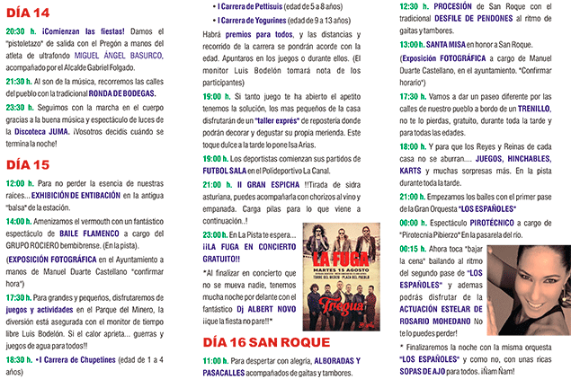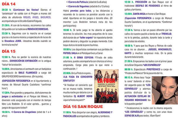 El 16 de agosto, a las 11 hora,s habrá pasacalles y alboradas para comenzar y a continuación “procesión de pendones” (12,30) y misa en honor a San Roque. A las 17,30 del domingo habrá un paseo en “trenillo”, gratuito y para todas las edades. Y a las 18,00 horas, juegos hinchables y karts. A las 21,00 horas será el turno de la Orquesta Los Españoles.