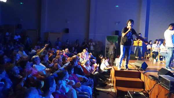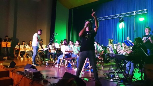 La actuación estaba prevista en la Plaza del Ayuntamiento pero finalmente la lluvia obligó a hacerla en el auditorio.
