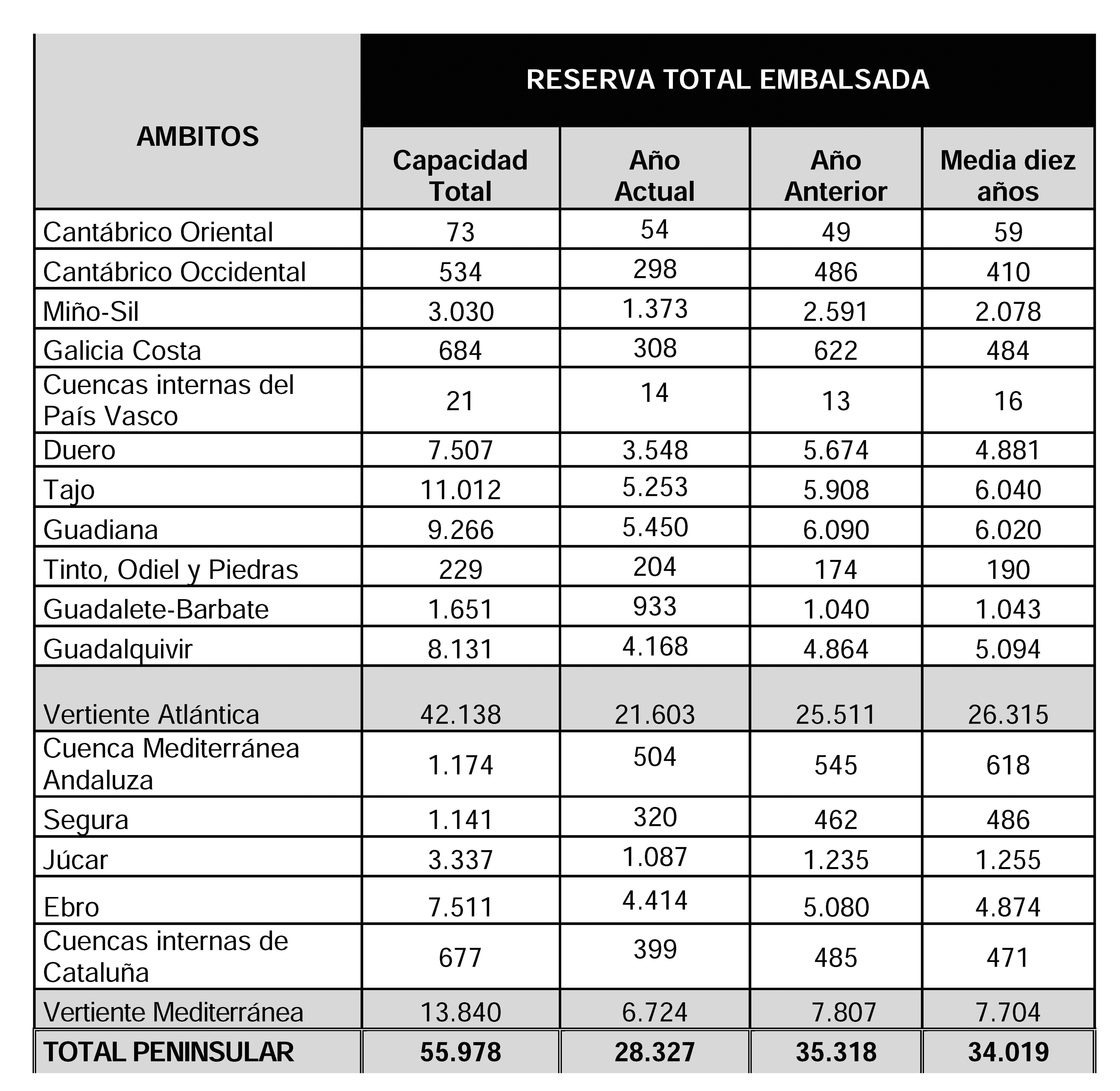 La reserva hidráulica española está al 50,6% de su capacidad total. Los embalses almacenan actualmente 28.327 hectómetros cúbicos (hm³) de agua, disminuyendo durante la última semana 105 hectómetros cúbicos (el 0,2% de la capacidad total).