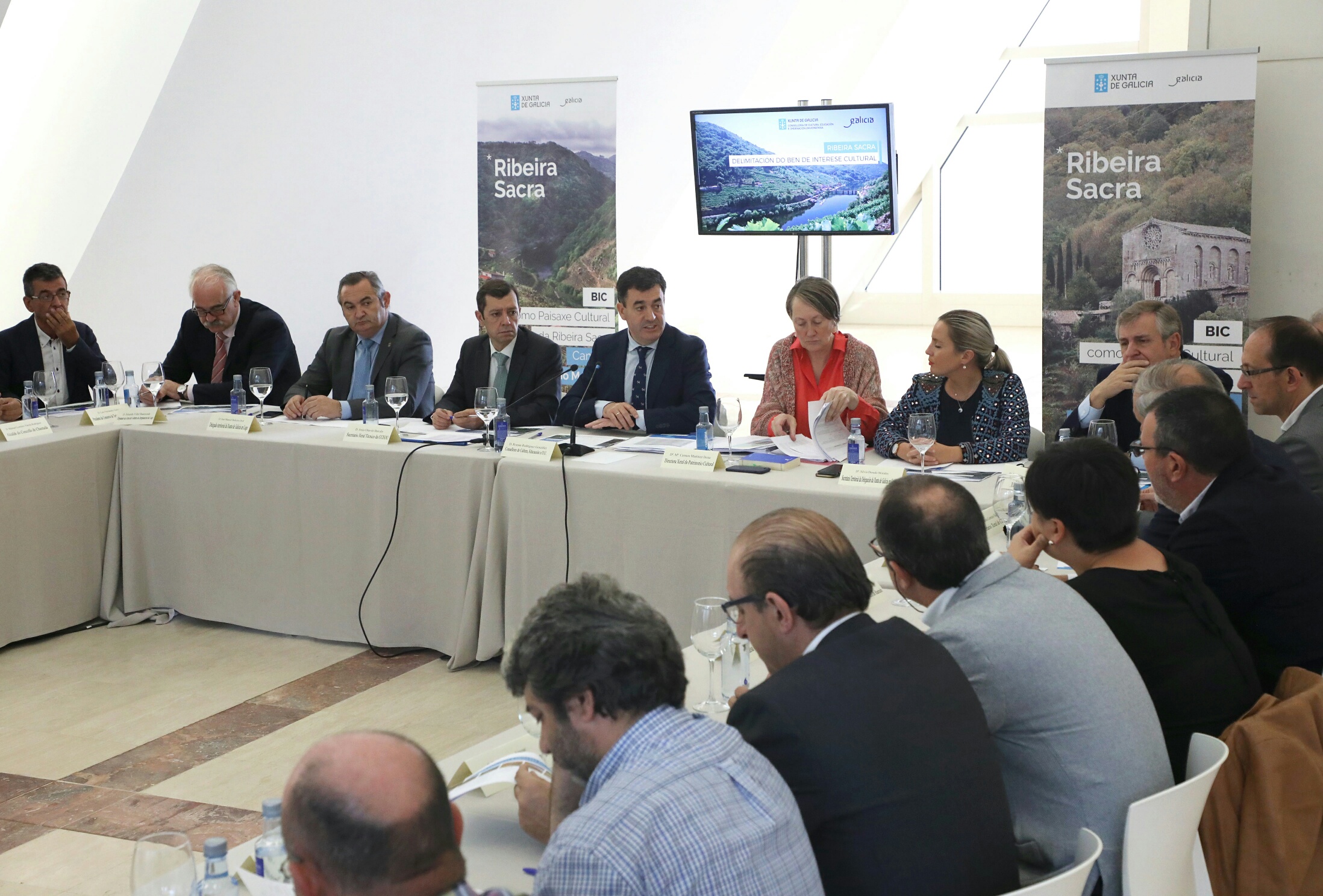 Representantes de la Xunta, de las Diputaciones de Lugo y Ourense, de los distintos ayuntamientos de la Ribeira Sacra incluidos en el ámbito del futuro Bien de Interés Cultural, del Consejo Regulador y del Consorcio de Turismo de la Ribeira Sacra, y del Inorde participaron en una reunión en la que los responsables de Patrimonio del Gobierno gallego les explicaron a los asistentes el proceso a seguir para lograr el máximo nivel de reconocimiento y protección de este territorio a caballo de las provincias de Lugo y Ourense, paso previo e imprescindible para promover su candidatura a Patrimonio Mundial de la Unesco. La reunión estuvo presidida por el conselleiro de Cultura y Educación, Román Rodríguez.