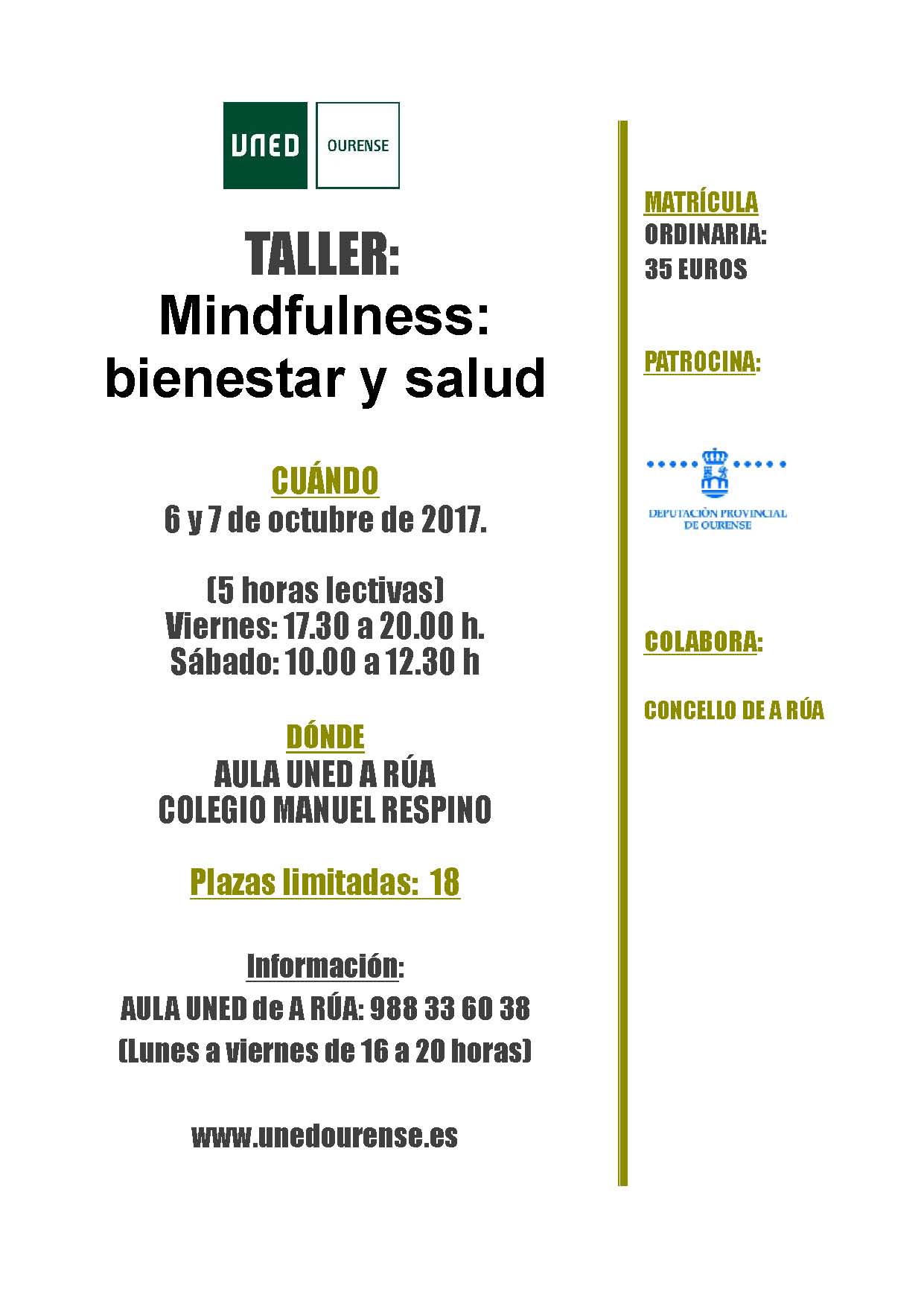 El Aula de la Uned en A Rúa acogerá los días 6 y 7 de octubre un curso titulado “Mindfulness: bienestar y salud”. Está organizado por la Uned con la colaboración del Ayuntamiento de A Rúa y el número de plazas es limitado, 18. El precio de matriculación es de 35 euros.