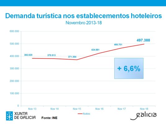 La estrategia de desestacionalización del turismo en Galicia consiguió un nuevo hito en el mes de noviembre, con un crecimiento del 6,6% en la demanda hotelera en comparación con el 2017 hasta conseguir los mejores registros en 11 años.