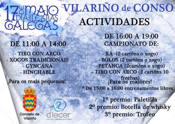 En Vilariño de Conso, habrá juegos y actividades el día propio de las Letras Galegas. Así, de 11,00 horas a 14,00 se podrá disfrutar del tiro al arco, juegos tradicionales, Gyncana e hinchables. Y de 16,00 a 19,00 horas se desarrollarán campeonatos para adultos de “rana”, bolos, petanca y tiro con arco. Habrá tres premios.