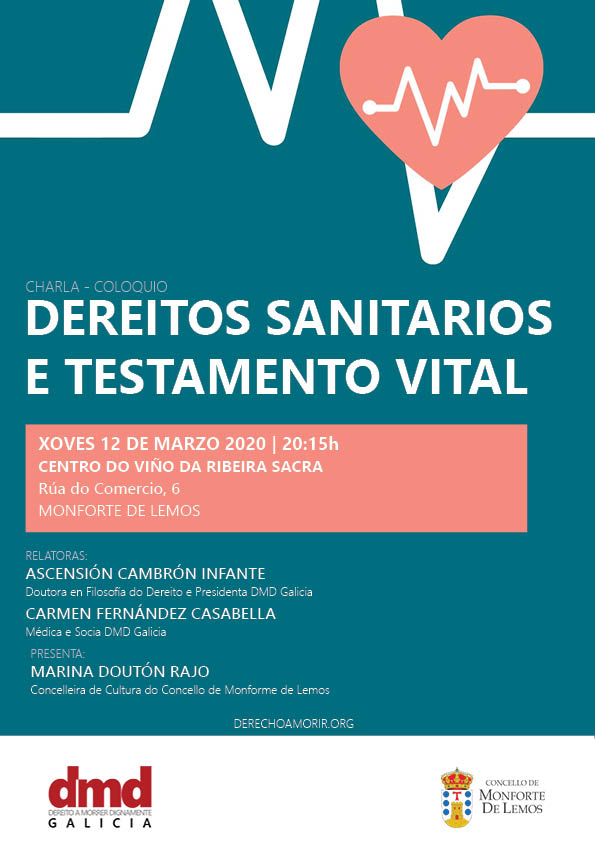 El salón de actos del Centro do Viño de Monforte (calle Comercio, 6) acogerá mañana jueves día 12 a las 20:15 horas a charla-coloquio titulada “Derechos sanitarios y testamento vital”, organizada por la asociación Derecho a Morir Dignamente Galicia ( DMD) , y cuenta con la colaboración del Ayuntamiento de Monforte.