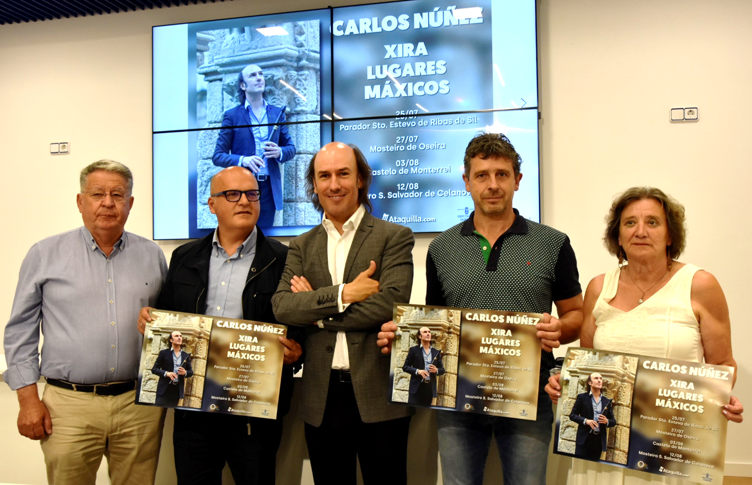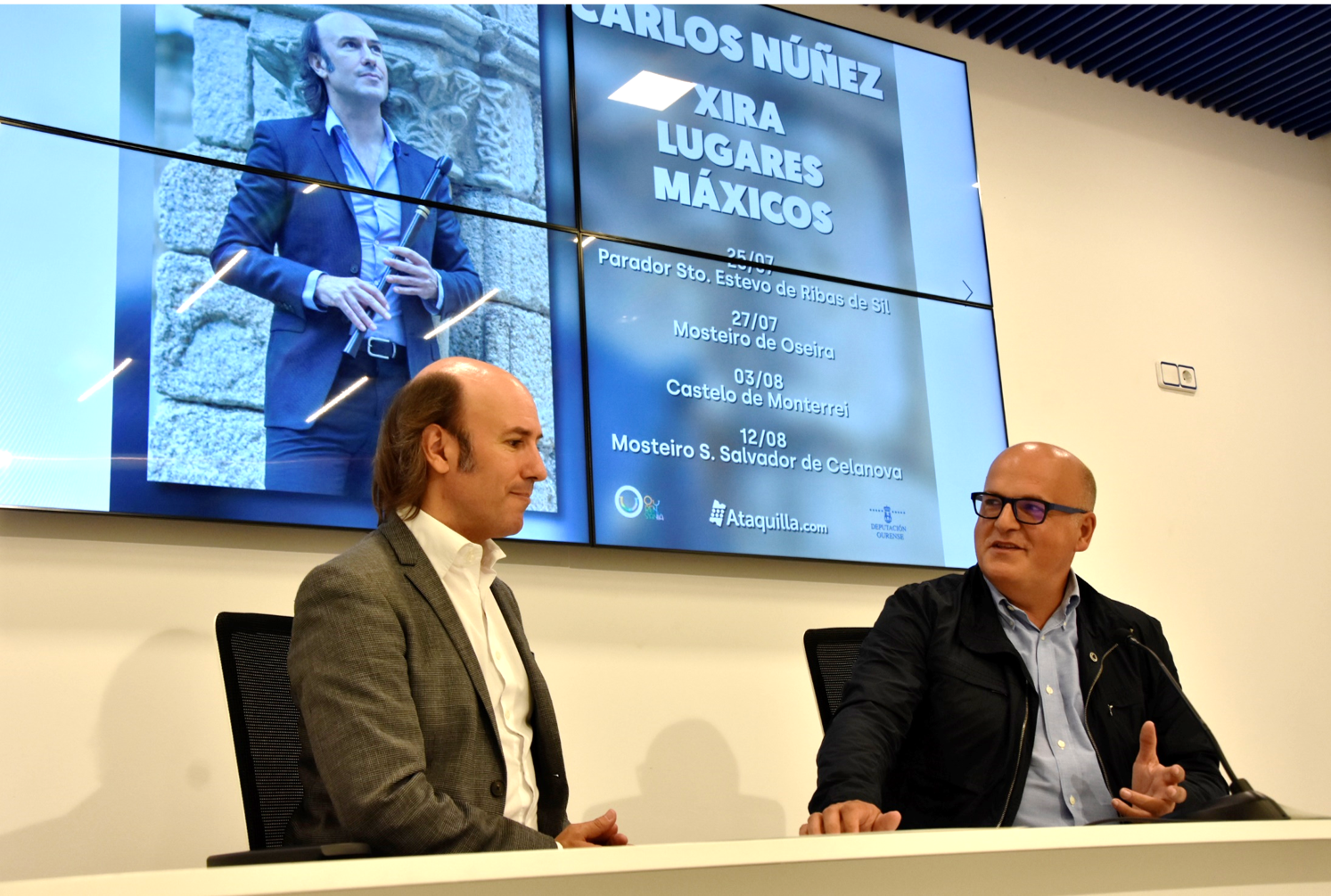 Tradición, historia, música y cultura de Galicia son los cuatro elementos que se unen en los cuatro conciertos que el gaitero Carlos Núñez ofrece este verano en la provincia de Ourense, con el apoyo de la Diputación de Ourense. La gira “Lugares máxicos” recorrerá los escenarios del castillo de Monterrei y los monasterios de Santo Estevo, Oseira y Celanova, siendo Ourense la provincia que más conciertos acoge en esta propuesta musical que supone “un maridaje perfecto entre patrimonio histórico y cultura, de la mano de uno de los grandes referentes musicales de nuestro país y con un prestigio internacional ganado a pulso, como es Carlos Núñez”, destacó el presidente de la Diputación, Manuel Baltar, en la presentación que tuvo lugar hoy en el Pazo Provincial.