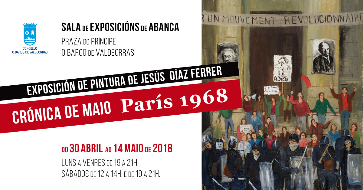 El próximo lunes, 30 de abril, será inaugurada en O Barco de Valdeorras, a las 20,30 horas, una exposición de pintura de Jesús Díaz Ferrer bautizada como “Crónica de mayo, París 1968”, coincidiendo con el 50 aniversario de los hechos ocurridos en la capital francesa en el citado año. La muestra, que consta de 25 dibujos a la tinta y 19 obras en acrílico sobre madera y papel de Jesús Díaz Ferrer (“Jesús del Barco”, como firmaba en sus primeras etapas) permanecerá abierta en la sala de Abanca, situada en la Plaza del Príncipe de la localidad, hasta el 14 de mayo, en horarios de 19,00 a 21,00 horas (de lunes a viernes) y de 12,00 a 14,00 y de 19,00 a 21,00 horas los sábados.