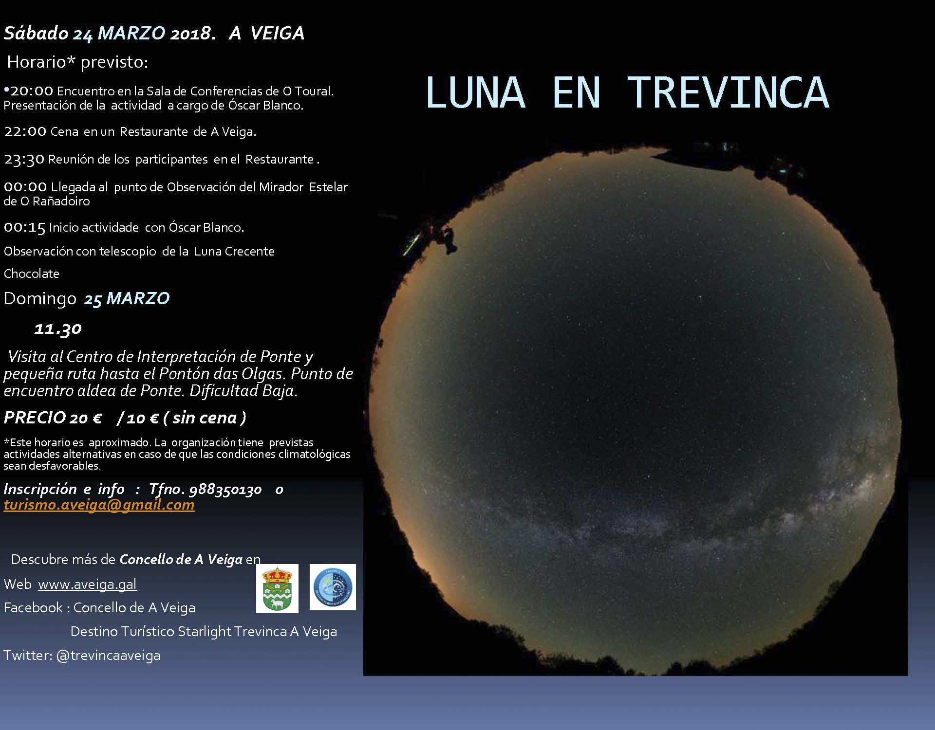 El sábado, 24 de marzo, a las 20,00 horas, la Sala de Conferencias de O Toural acogerá a los participantes para la presentación de esta actividad a cargo de Óscar Blanco. Posteriormente, a las 22,00 horas será la cena en un restaurante de A Veiga, donde a las 23,30 se reunirán los participantes para planificar la salida. A las 00,00 de la noche está prevista la llegada al Mirador Estelar de O Rañadoiro y a las 00,15 está previsto el inicio de la actividad con Óscar Blanco. Se desarrollorá la observación de la luna creciente con telescopio y, al finalizar, habrá una chocolatada.