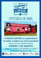 Viernes 7: Espectáculo de magia “A volta a Galicia en 313 concellos”. Magia dentro del tráiler del conocido MAGO ANTÓN. Estará de 12:00 a 21:00 h. en la Praza España con entrada por turnos y en grupos reducidos.