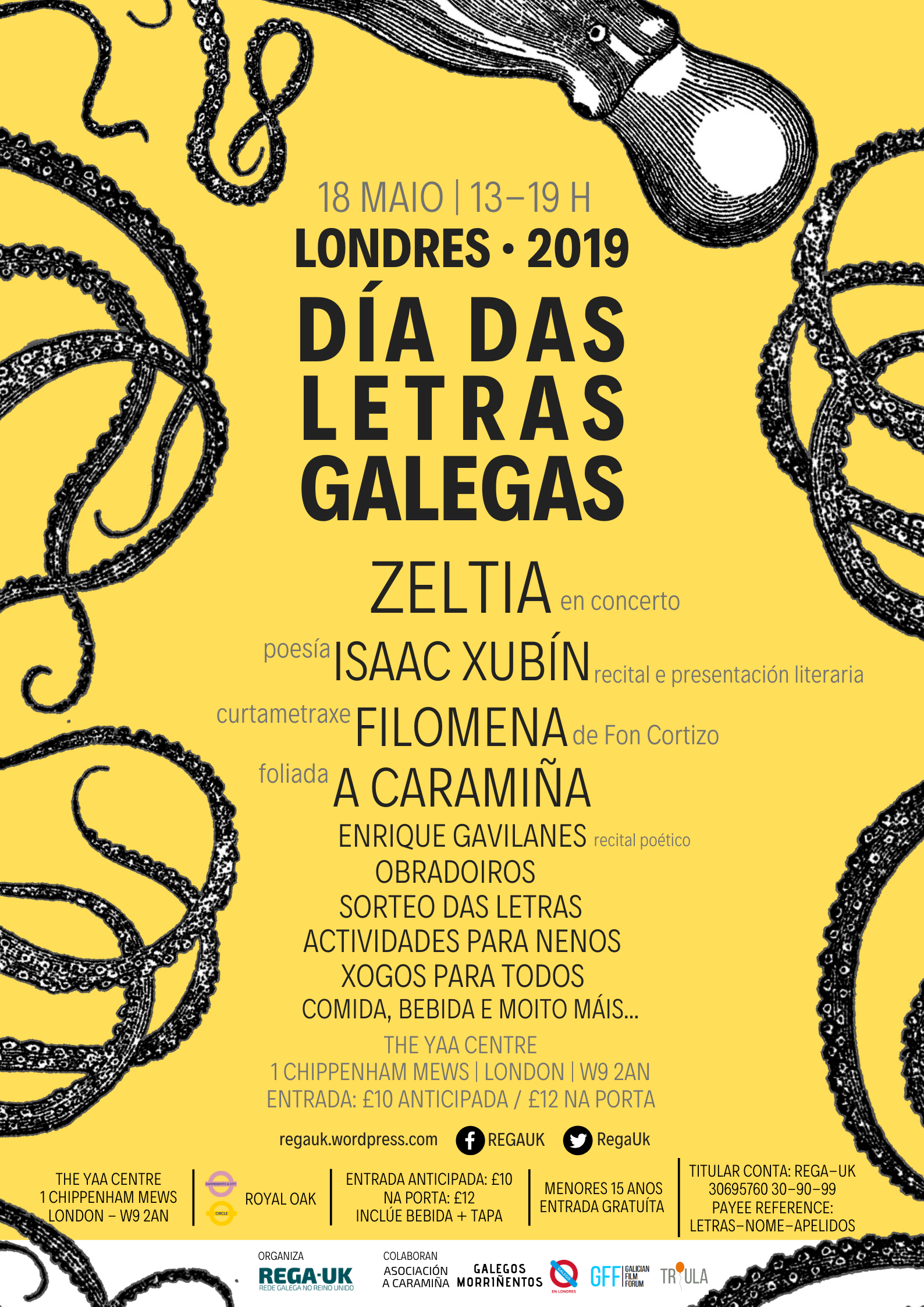 Este es el segundo año en el que RIEGA- UK organiza en la ciudad del Támesis un evento en el que se mezclan manifestaciones culturales diversas, como la literatura, la música, el cine o la gastronomía. Igual que en la edición anterior, la actividad cuenta con la colaboración de otras organizaciones socioculturales gallegas de la capital británica, como la Asociación A Caramiña, Galegos Morriñentos, Galego en Londres, Galician Film Forum y Troula..