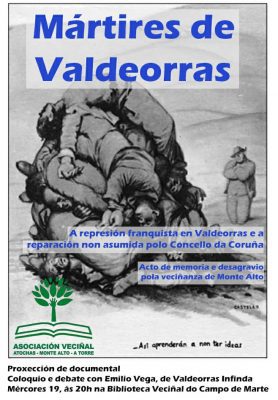 A Asociación Veciñal das Atochas – Monte Alto convoca un acto de solidariedade coa veciñanza de Valdeorras, na memoria dos represaliados e en desagravio polo decidido no pleno do noso Concello. O acto vai consistir na proxección dun documental e nunha charla e debate que conducirá Emilio Vega, de Valdeorras Infinda, e desenvolverase no noso local na biblioteca veciñal do campo de Marte o mañá mércores 19 de xaneiro a partir das 20 horas.