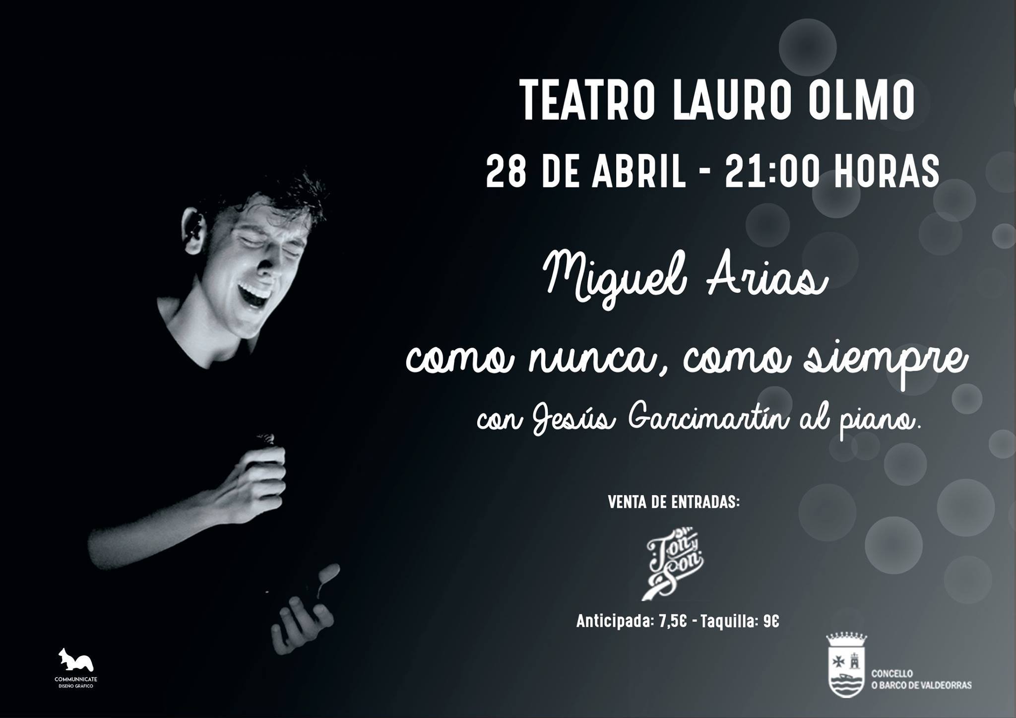 El cantante valdeorrés Miguel Arias actúa mañana viernes, 28 de abril, en el Teatro Lauro Olmo de O Barco, a las 21,00 horas. Se trata de un concierto que ha bautizado “Como nunca, como siempre”, porque muestra la evolución como artista si bien sigue siendo el mismo. “Yo no soy un actor, que se sube a un escenario y se transforma. Yo soy el mismo, no separo la faceta personal y artística”, puntualiza.