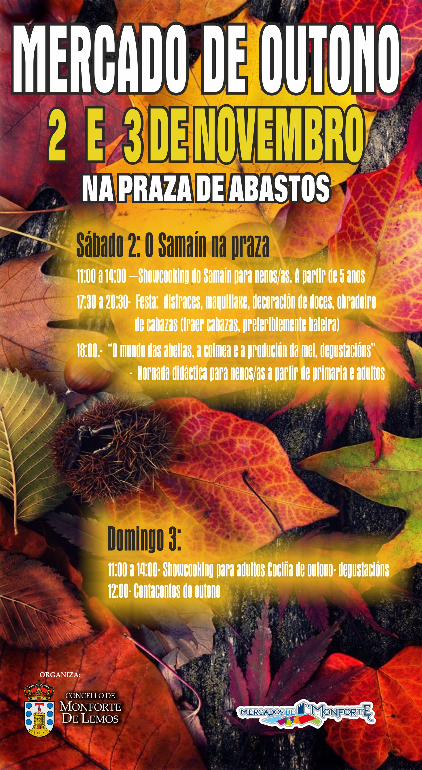 El Ayuntamiento de Monforte celebrará los días 2 y 3 de noviembre el tradicional Mercado de Otoño en la Plaza de Abastos de Monforte. En este espacio va a ser posible adquirir productos de esta temporada, como miel, pimentón, setas, castañas, nueces, mermeladas, sidra, dulces, quesos o embutidos. En total serán 14 puestos de venta directa de este tipo de productos.