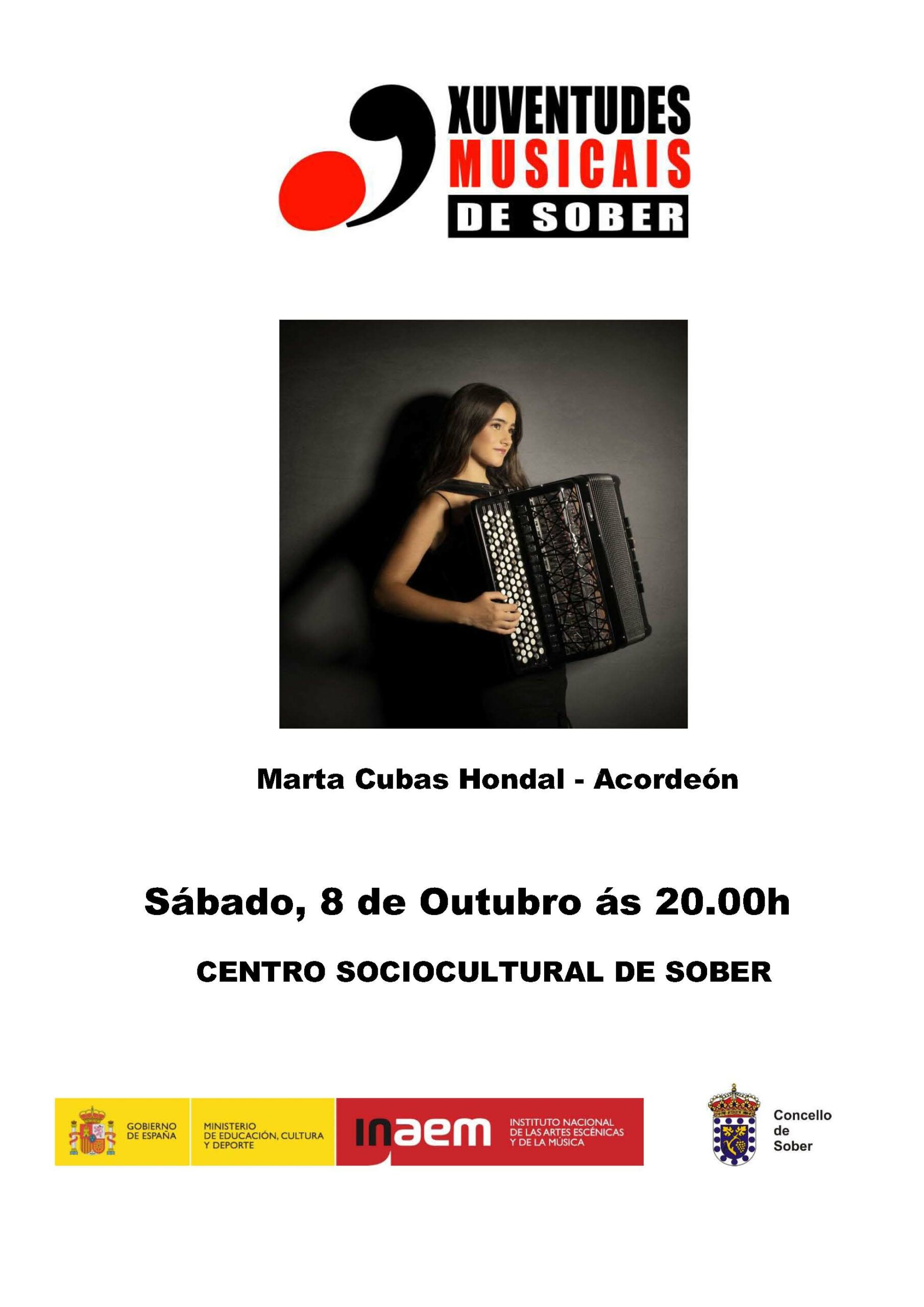 O Concello de Sober, en colaboración coas Xuventudes Musicais de Sober, bota a andar o sábado o programa Música no Outono cun concerto da acordeonista Marta Cubas. Este concerto recolle obras que mostran algúns dos diferentes estilos que atravesou a música, embarcándonos nunha viaxe espazo-temporal que comeza en Nápoles ao redor do 1700 e finaliza en Nova York no S.XXI, percorrendo épocas que van desde o Barroco ata o Contemporáneo. Nesta travesía vense reflectidos os cambios nas técnicas compositivas e como se vai xerando unha necesidade de innovación a través dos recursos sonoros dos instrumentos.