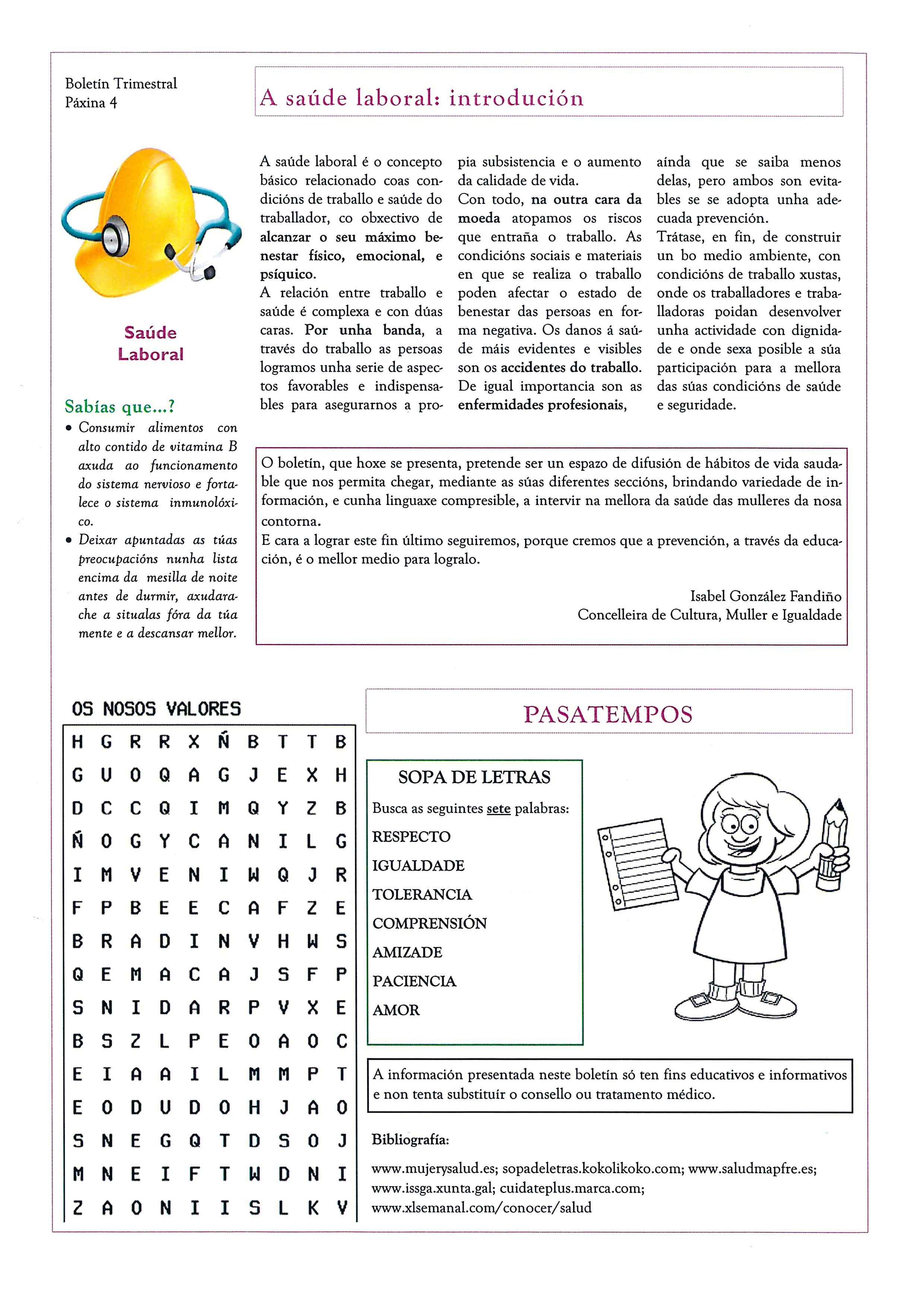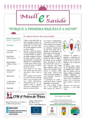 En este mes de octubre nace el boletín trimestral «Muller e Saúde», coordinado por el CIM, con la finalidad de servir como canal para acercar, divulgar y debatir sobre la salud, tratando de ponerla en valor y esperando, en fin, que sea de utilidad a todo el vecindario del municipio.