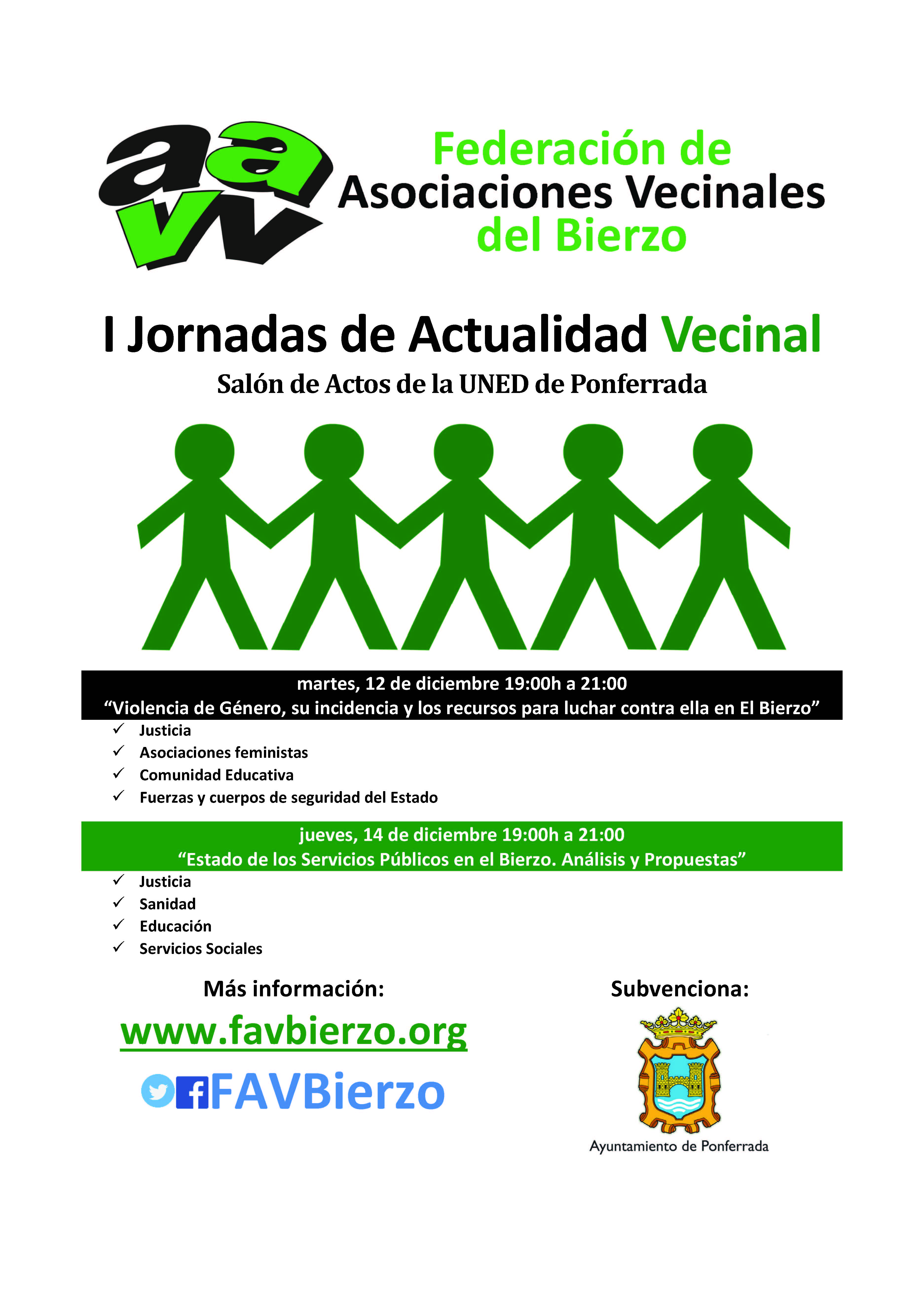 La Federación de Asociaciones Vecinales del Bierzo han programado unas “Jornadas de Actualidad Vecinal” que se celebrarán en Ponferrada (en el Salón de Actos de la UNED) el próximo martes 12 de diciembre y el jueves 14 de diciembre en horario de 19:00 a 21:00 horas.
