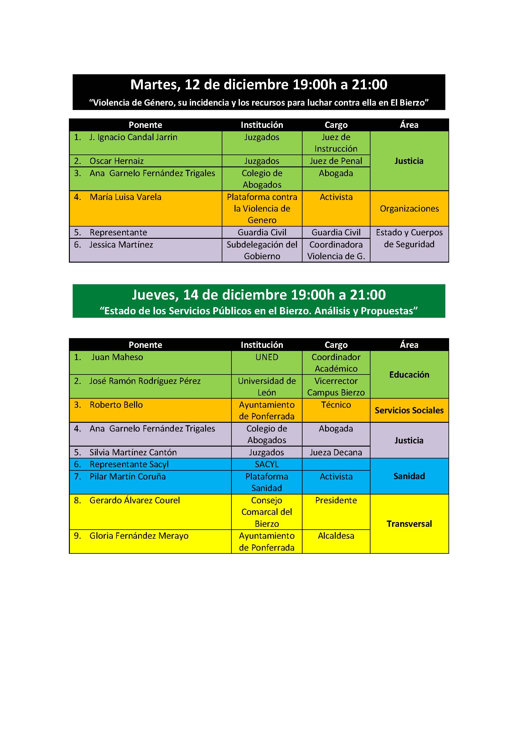 ·  La mesa del jueves, 14 de diciembre tratará el “Estado de los Servicios Públicos en el Bierzo. Análisis y Propuestas de Mejoras”, participarán miembros del sector de la justicia, la sanidad, la educación universitaria.