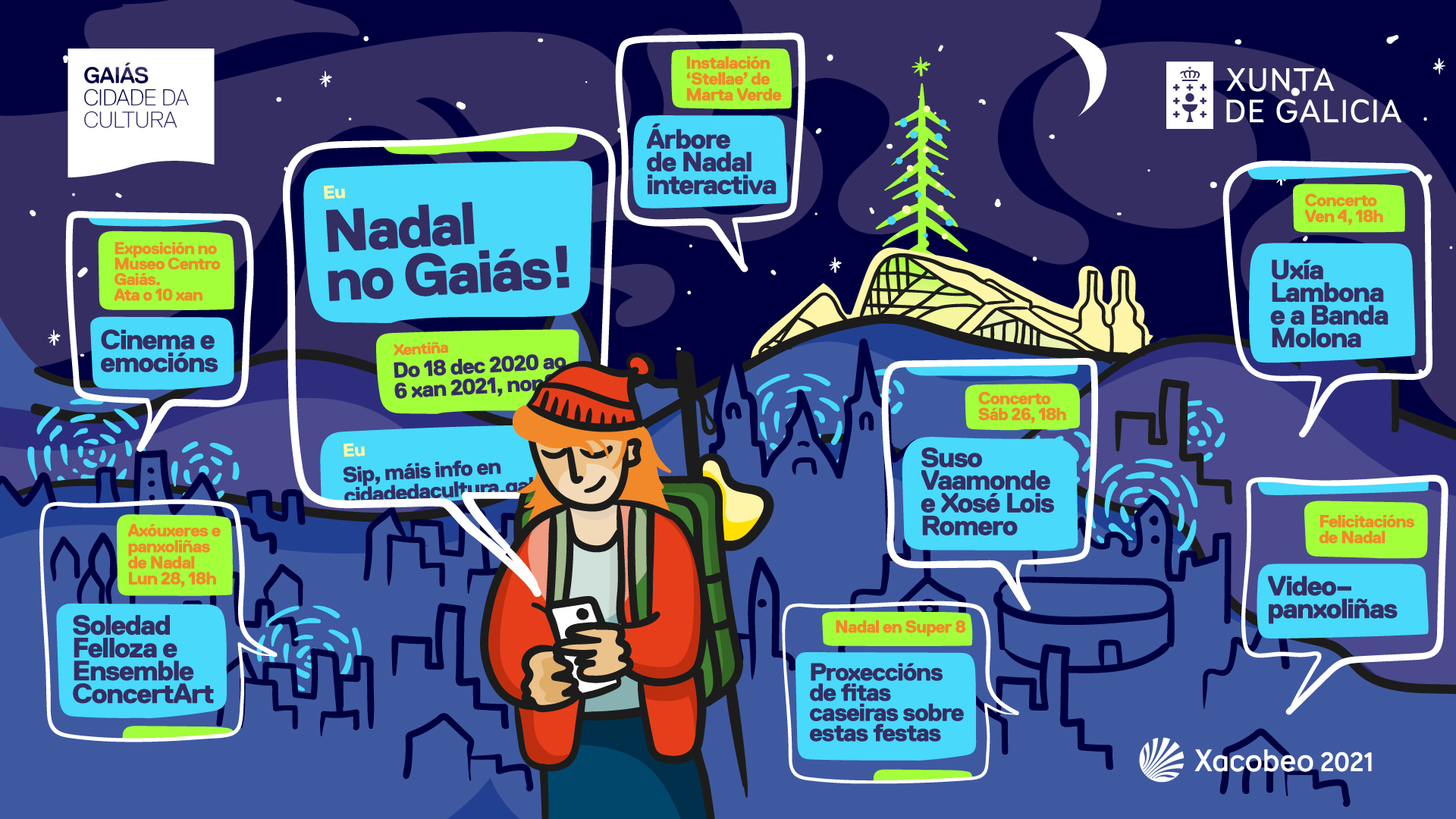 La Xunta de Galicia invita a las familias a disfrutar de 18 de diciembre a 6 de enero de una Navidad en el Gaiás en la que un árbol interactivo gigante, Stellae, será el gran protagonista de estas fiestas en la Cidade da Cultura: ya que van a ser las y los propios visitantes, a través de sus dispositivos móviles, los que decidan cómo iluminarla y las composiciones musicales que emanen de ella.
