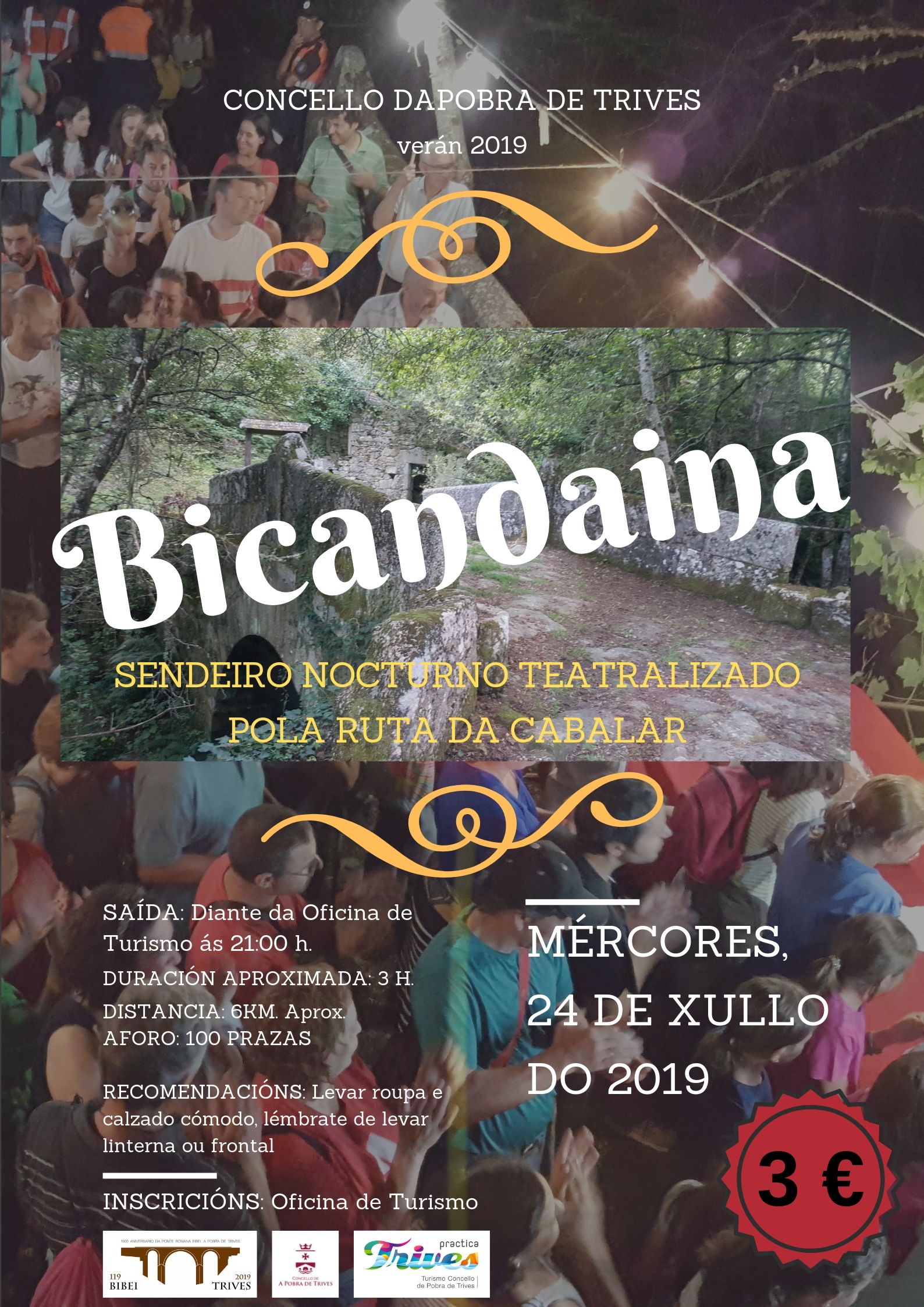 A las 21:00 horas da comienzo la actividad saliendo desde la Oficina de Turismo (en Santa Leonor) dirección una ruta por el bosque donde la animación que se encontrarán los andarines en el sendero, lo hará diferente. Un recorrido circular de unos 6 km. aproximadamente en dirección a la Ponte Cabalar, finalizando nuevamente en Santa Leonor y durante lo cual se podrá disfrutar de diferentes escenas teatrales que harán que los participantes vean los bosques triveses llenos de magia y vida. En esta ruta la Bica también tendrá su importante papel, anunciando de alguna manera el fin de semana de la Fiesta de la Bica.