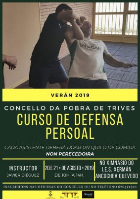 El instructor Javier Diéguez impartirá los días 20 y 21 de agosto un Curso de Defensa Personal. Será en horario de 10:00 h a 14:00 horas en el Gimnasio del IES Xermán Ancochea Quevedo de A Pobra de Trives.